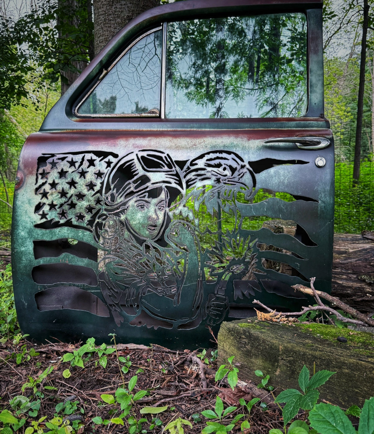 As seen on Fox and Friends! A hand plasma cut 53 Plymouth car door. Designed for the true blue collar patriot.